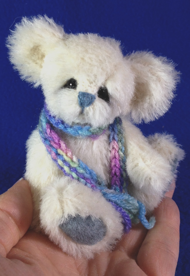 He was created out of soft white alpaca fabric. His face has been carefully hand trimmed and shaded to bring out his personality. He has ice blue upholstery fabric foot pads, a blue hand stitched nose, shiny black glass eyes and a tiny scarf to keep him warm.