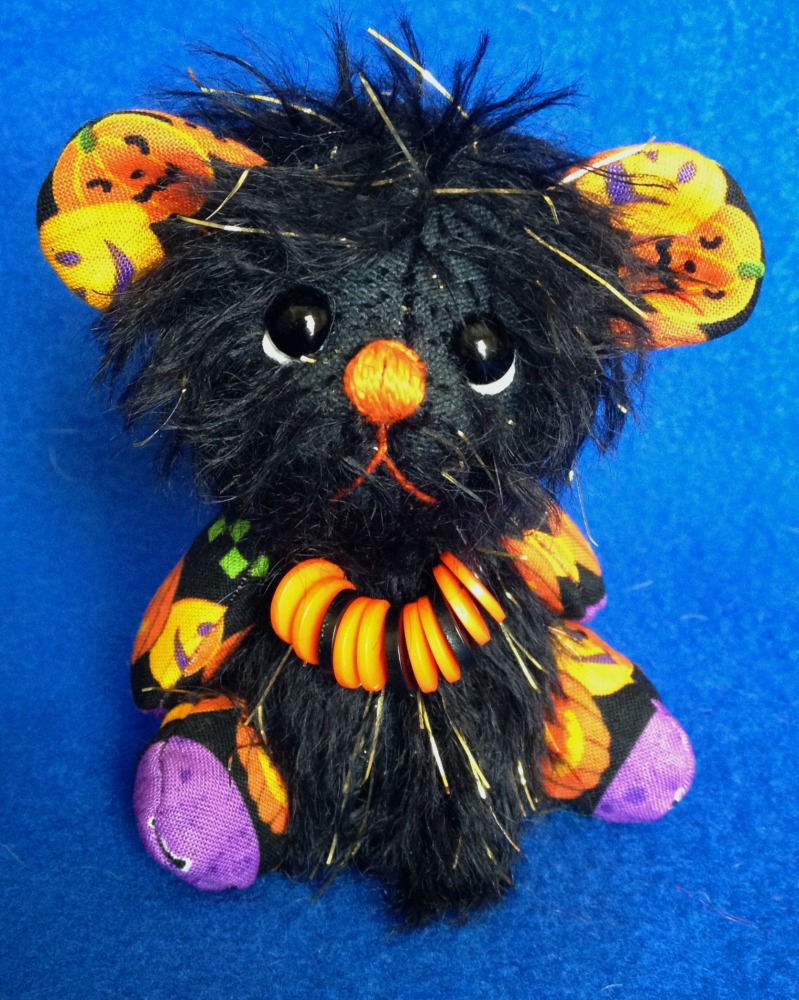 He was make out of black mohair with gold strands and Halloween cotton fabric.