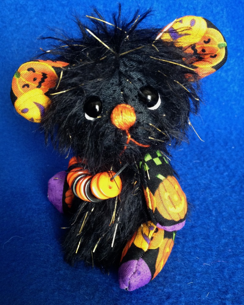 He was make out of black mohair with gold strands and Halloween cotton fabric.